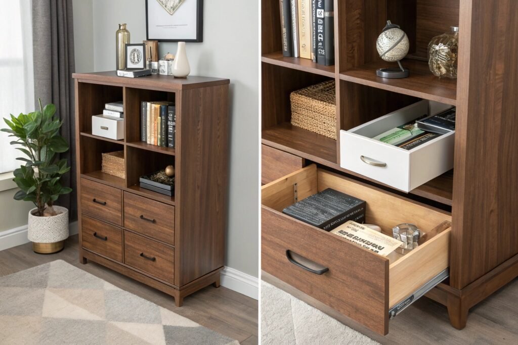 Space-saving, custom-designed wood storage cabinets and bookshelves, combining form and function to keep your space organized and stylish