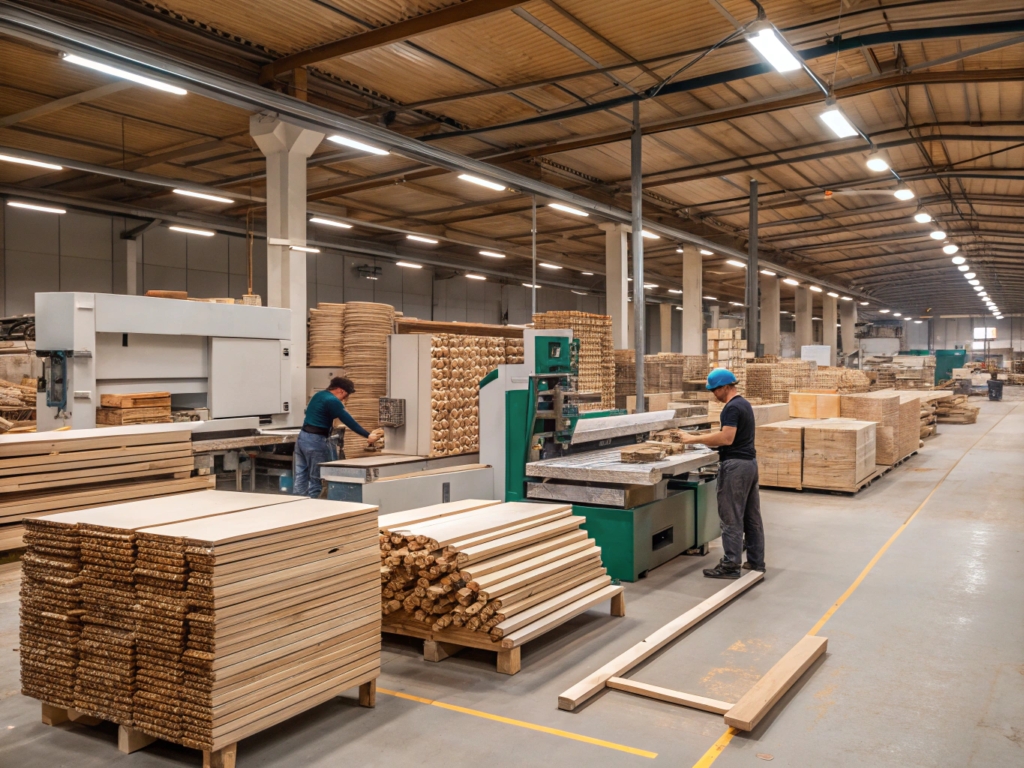 Automated glue rollers apply precise amounts of PVA, followed by pressing machines that ensure consistent curing under controlled heat and pressure.