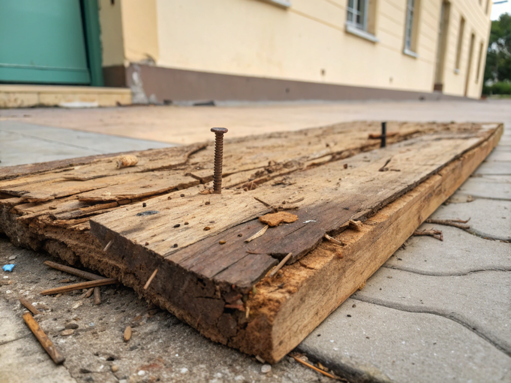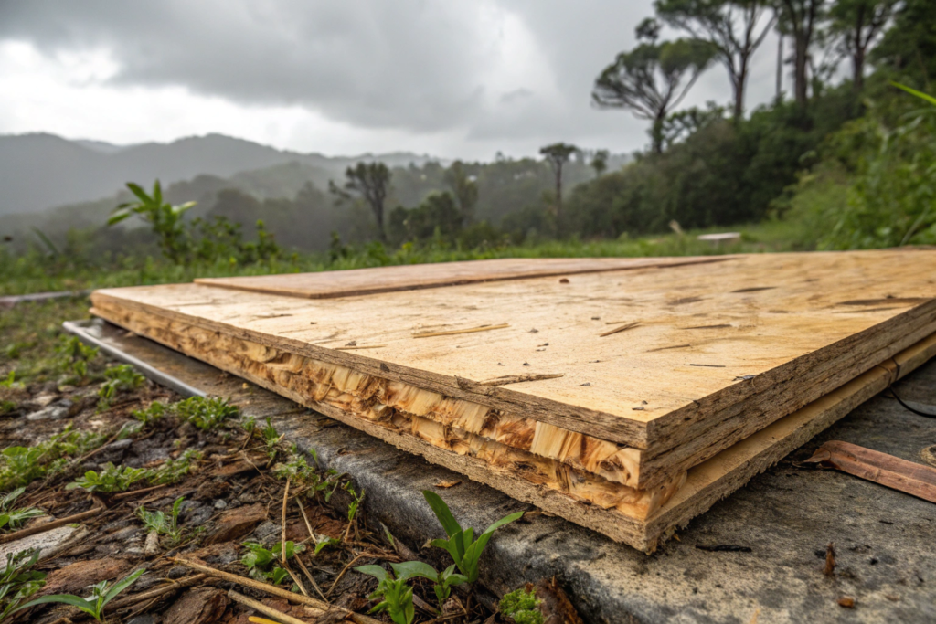 Plywood used near the ground without separation quickly absorbs moisture. Rain splash, standing water, and ground vapor make such locations high-risk.