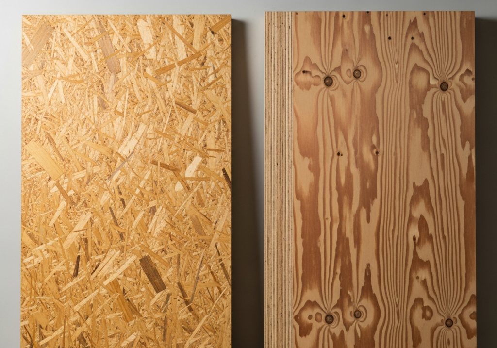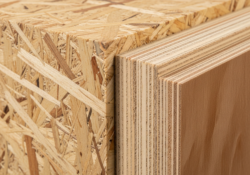 OSB is made from layers of wood strands oriented in alternating directions, while plywood is built from thin veneer sheets glued together in perpendicular layers.