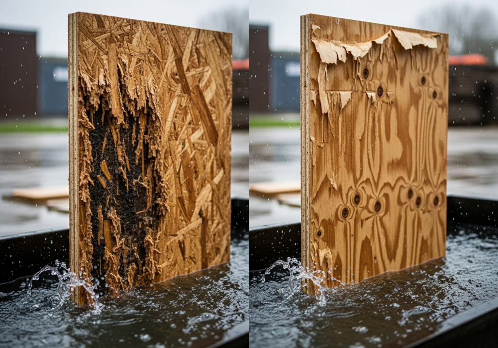 OSB Type 3 or 4 panels are used in humid zones, with factory-applied wax or resin seals. Plywood remains the preferred choice for roofs and areas with repeat wet-dry cycles.