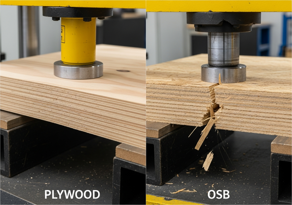 Plywood has better bending strength and fastener retention, while OSB performs well in shear strength, making it suitable for wall bracing.