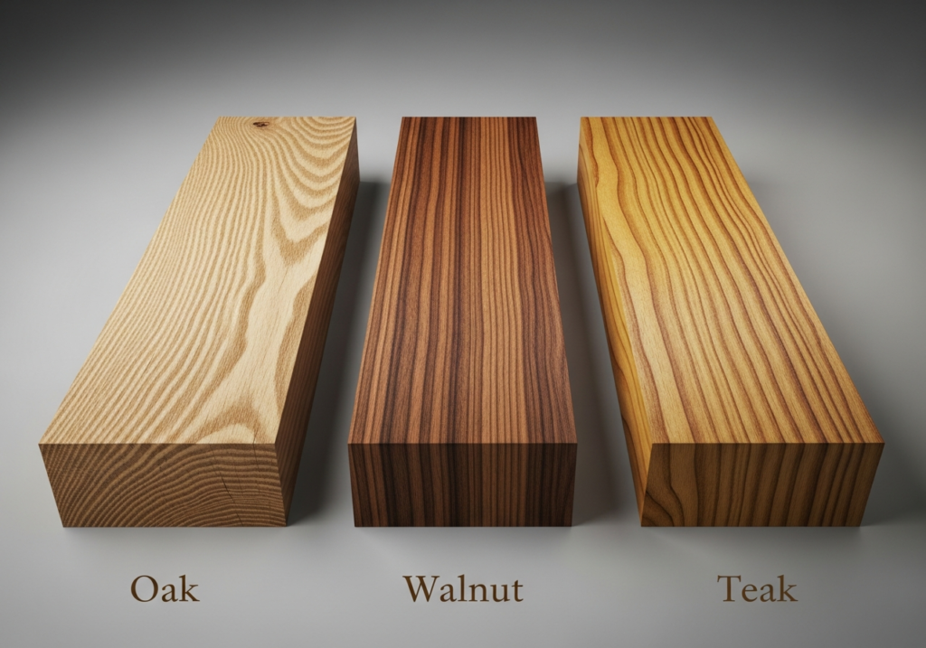 Hardwoods come from angiosperm trees like oak, maple, walnut, and birch, with more complex cell structures that often yield higher density and greater mechanical strength.